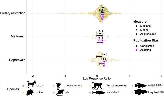 연구팀은 이 연구에서 어류, 생쥐, 쥐, 영장류 등 8종의 척추동물을 대상으로 한 167건의 수명 관련 연구 데이터를 메타 분석하는 방식으로 식이제한과 라파마이신, 메트포르민의 수명 연장 효과를 비교했습니다.