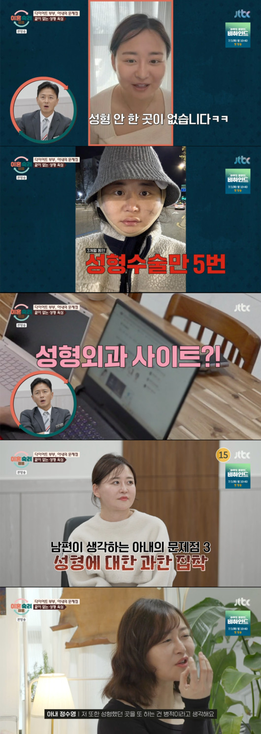 '이혼숙려캠프' 다이어트 부부의 아내가 성형에 중독된 모습을 보였다.