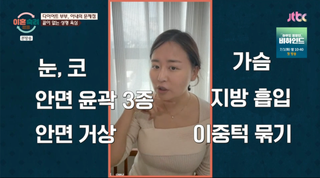 성형 중독일 정도로 외모에 집착하는 와이프는 일하는 중에 노트북으로 성형외과 사이트에 접속해 서칭을 했다. 와이프는 안한 수술이 없을 정도로 이미 엄청난 종류의 성형 수술을 한 상태였다. 3개월 동안 성형수술만 5번을 했다고. 와이프는 더 하고 싶은 부위로 입술 필러와 볼살 흡입, 그리고 이마 필러를 꼽았다.
