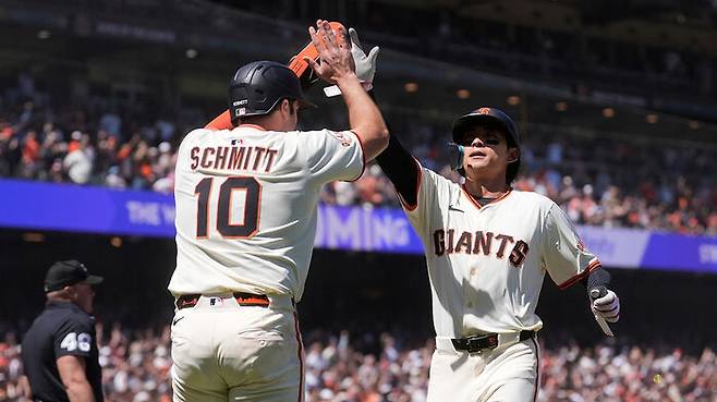 ▲ 샌프란시스코 이정후(오른쪽)가 20일(한국시간) 미국 캘리포니아주 샌프란시스코 오라클파크에서 열린 클리블랜드 가디언스와 메이저리그 홈 경기에 7회에 득점한 뒤, 슈미트와 손을 마주치고 있다.
