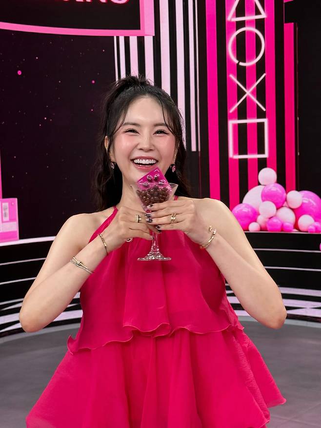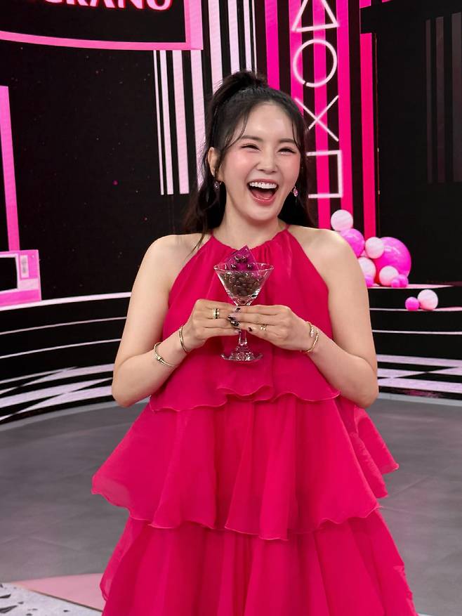 사진 속 장영란은 핫핑크 컬러의 튤 드레스를 입고 상큼한 포니테일 헤어스타일과 함께 완벽한 미소를 지어 보였다.