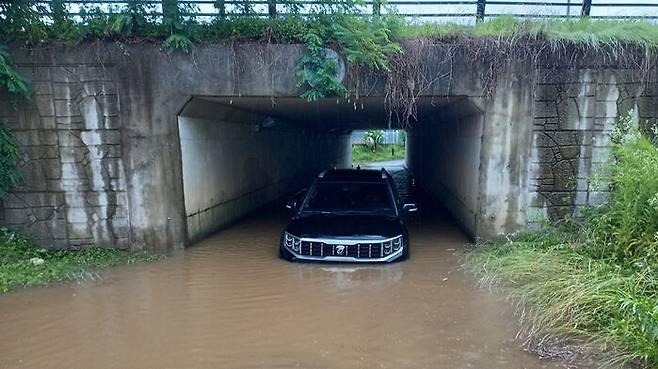 ▲ 20일 오전 경기 고양시에서 지하차도를 지나던 차량이 물에 잠겨있다.