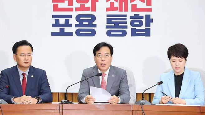 ▲ 국민의힘 송언석 원내대표가 20일 서울 여의도 국회에서 열린 원내대책회의에서 발언하고 있다. 왼쪽부터 유상범 원내운영수석부대표, 송 원내대표, 김은혜 원내정책수석부대표.