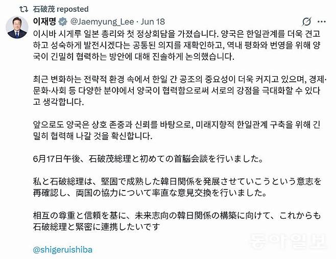 이시바 총리는 19일 밤 “저와 이 대통령의 리더십 하에 일한 관계의 안정적인 발전을 위해 양국 정부 간 긴밀한 소통을 추진해 나갈 것, 대북 대응과 관련해서도 일한, 일한미가 긴밀히 공조할 것 등을 확인했다”며 “정상간에도 긴밀한 소통을 계속해 나가고자 한다”는 메시지를 일본어와 한국어로 나란히 써서 올렸다.
