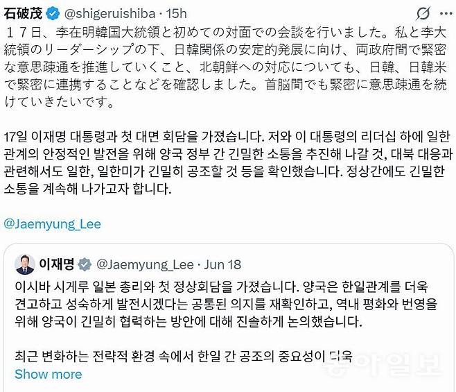 17일(현지 시간) 첫 한일 정상회담을 가진 이재명 대통령과 이시바 시게루(石破茂) 일본 총리가 소셜미디어 X(옛 트위터)에서 서로 상대의 언어로 교류를 이어갔다. 이 대통령은 일본어로, 이시바 총리는 한국어로 ‘온라인 셔틀 외교’를 이어간 것이다.