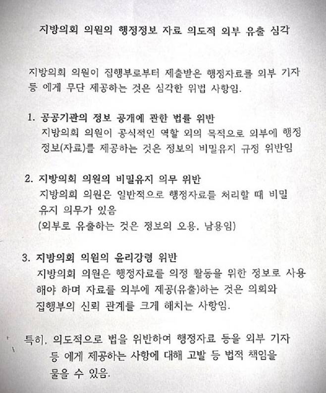 '지방의회 의원의 행정정보 자료 의도적 외부 유출 심각' 제목의 문서에는 지방의회 의원이 집행부로부터 제출받은 행정자료를 외부 기자 등에게 무단 제공하는 것은 심각한 위법 사항이라는 내용이 담겼다.