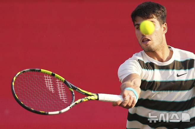 [런던=AP/뉴시스] 카를로스 알카라스(2위·스페인)가 19일(현지 시간) 영국 런던 퀸스 클럽 앤디 머리 아레나에서 열린 2025 남자프로테니스(ATP) 투어 HSBC 챔피언십(ATP 500) 16강전에서 하우메 무나르(59위·스페인)와 경기하고 있다. 알카라스가 3시간 23분의 혈투 끝에 2-1(6-4 6-7 7-5)로 승리하고 8강에 올랐다. 2025.06.20.