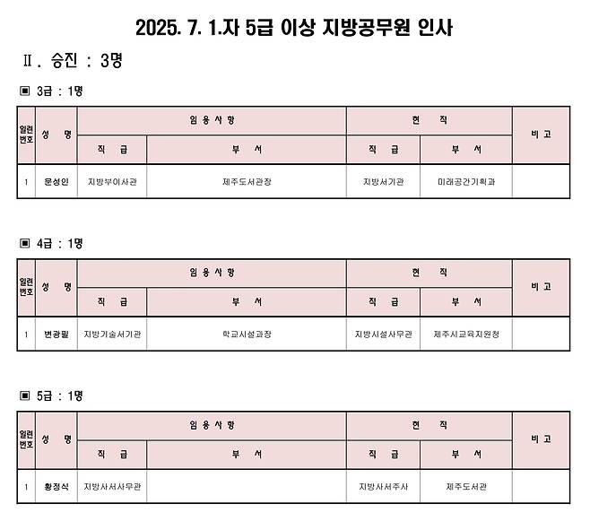 3급 인사는 제주도서관장에 문성인 미래공간기획과장(서기관)을 지방부이사관으로 승진-전보했다. 행정국장에는 한봉순 제주도서관장(지방부이사관)이 자리를 옮긴다. 양윤삼 행정국장은 퇴직준비교육 파견 발령했다.