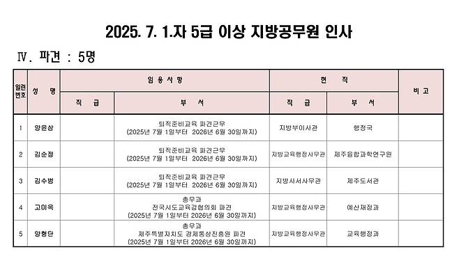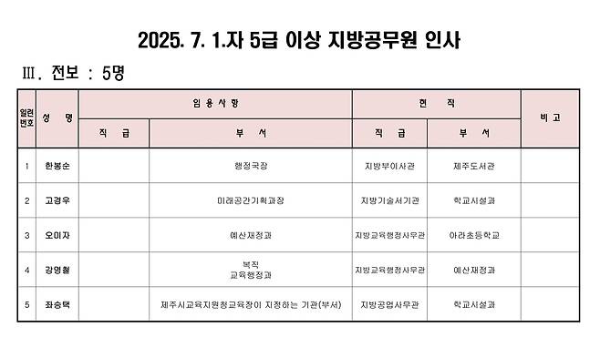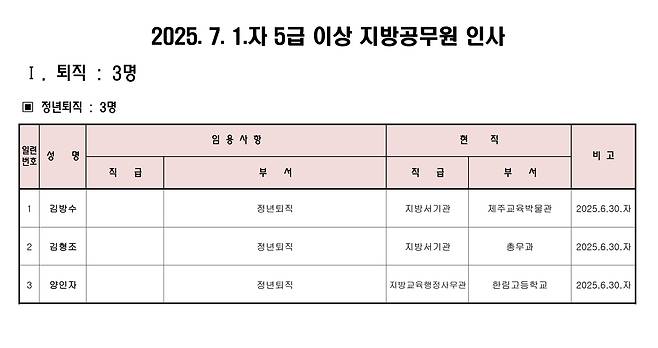 4급 인사는 학교시설과장에 변광필 제주시교육지원청 교육시설지원과장(사무관)을 지방기술서기관으로 승진-전보했다. 미래공간기획과장은 고경우 학교시설과장(서기관)이 맡는다. 퇴직준비 교육 중인 김방수·김형조 서기관은 정년퇴직한다.