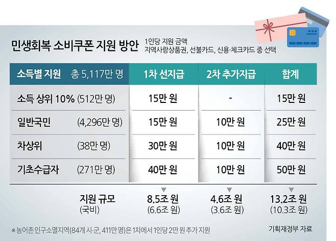 1·2차를 합하면 1인당 지급 액수는 ▷소득 상위 10% 15만원 ▷일반 국민 25만원 ▷차상위 계층 40만원 ▷기초수급자 50만원이다. 여기에 농어촌 인구소멸지역 89곳 중 84곳 지역민(411만명)에게는 1차 지급 때 1인당 2만원이 추가돼 1인당 최대 지급액은 52만원이다.