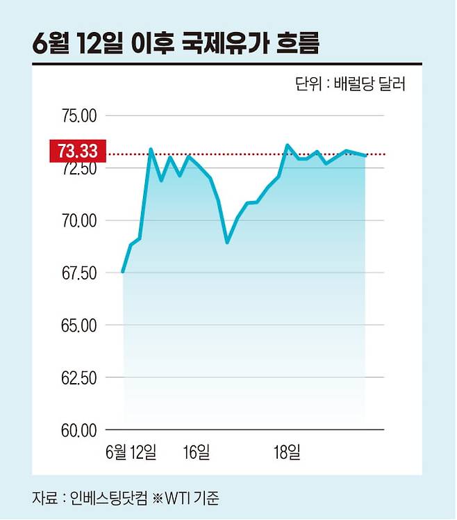 국제유가 변동은 통상 2주가량 차이를 두고 국내 주요소 가격에 반영되기 때문에 아직 가격이 오를 여지가 남아 있다고 볼 수 있다. 공습 직후인 6월 13일 두바이유는 배럴당 72.49달러, 브렌트유는 74.23달러, WTI는 72.98달러로 줄줄이 70달러 선을 넘었다.