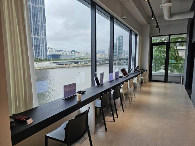 ‘2F’에 도착해 엘리베이터 문이 열리면 수영강 전경이 한눈에 들어오는 통창이 먼저 시선을 사로잡는다. 눈을 돌려 매장을 보니 흑백으로 구분된 모던한 인테리어가 깔끔한 인상을 준다. 매장 안쪽에 해당하는 흑색 구역엔 스피커가, 수영강이 보이는 백색 구역엔 이어폰과 헤드폰이 전시돼 있다.