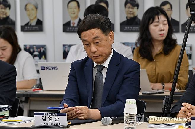 (과천=연합뉴스) 류영석 기자 = 김영관 방송통신위원회(방통위) 사무처장 직무대행이 20일 경기 정부과천청사 방송통신위원회에서 열린 국정기획위원회 업무보고에서 김현 국정기획위원회 사회2분과 기획위원의 발언을 듣고 있다. 2025.6.20 [공동취재]