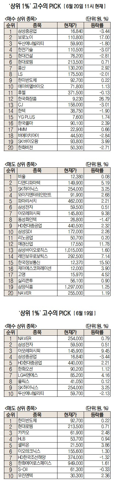 이날 미래에셋증권에 따르면 미래에셋증권 주식 거래 고객 중 최근 1개월간 투자수익률 상위 1%에 해당하는 ‘주식 초고수’들이 오전 11시까지 가장 많이 사들인 종목은 삼성중공업이다.