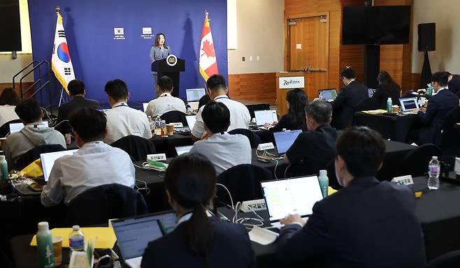 | ▲ 강유정 대통령실 대변인이 16일(현지시간) 캐나다 앨버타주 캘거리 한 호텔의 한국 프레스센터에서 이재명 대통령의 주요 7개국(G7) 정상회의 참석 관련 브리핑을 하고 있다. |