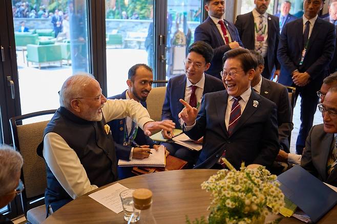 | ▲ 이재명 대통령과 나렌드라 모디 인도 총리가 17일(현지시간) 캐나다 앨버타주 캐내내스키스 주요 7개국(G7) 정상회의장에서 정상회담을 하고 있다. 2025.6.18 [공동취재] |