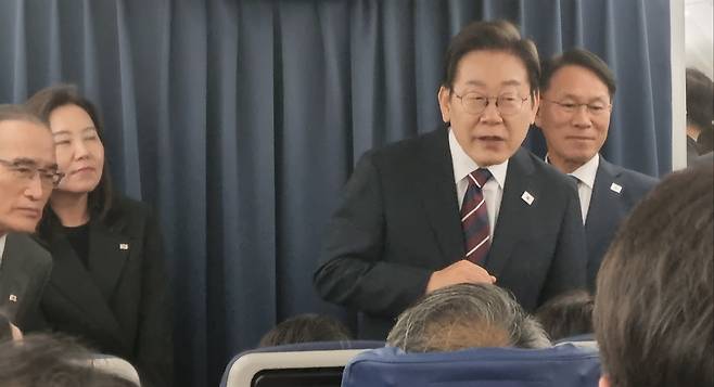 | ▲ G7 정상회의를 마치고 귀국길에 오른 이재명 대통령이 지난 18일 공군1호기에서 기자들의 질문을 받기 위해 귀를 기울이고 있다. |