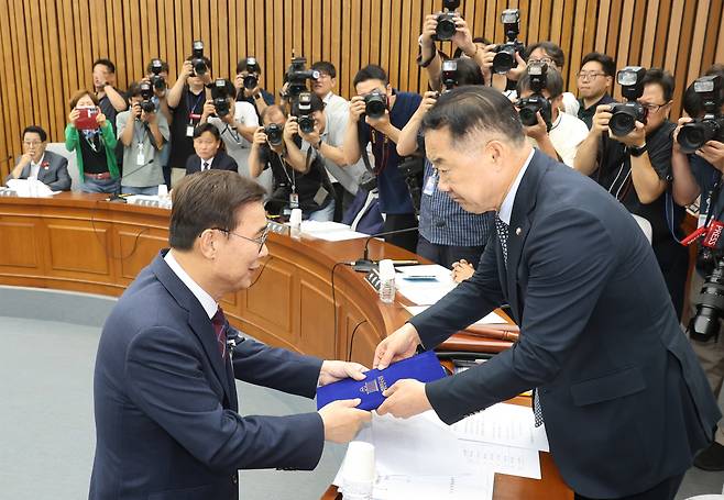 | ▲ 이종석 국가정보원장 후보자가 19일 오전 서울 여의도 국회 정보위원회에서 열린 인사청문회에 참석해 선서를 마친 뒤 신성범 정보위원장에게 선서문을 전달하고 있다. |