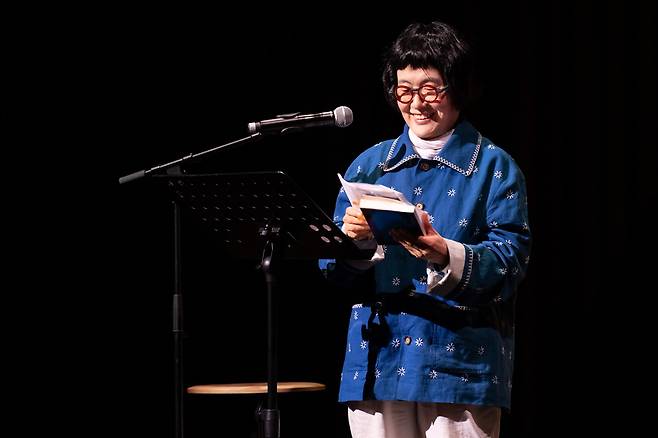 | ▲ 시집 <날개 환상통>을 낭독하고 있는 김혜순 시인 “지금부터 여러분은 자신의 몸에서 세상에서 제일 가볍고 투명한 새를 한 마리 꺼냈다고 상상하세요. 그 새가 하는 말을 듣고, 그 새의 행동을 본다고 상상하면서 제 시를 들어주세요.” 김혜순 시인은 현지 관객들에게 인사말을 전한 뒤 <날개 환상통>의 “새의 시집”,“고잉 고잉 곤”, ”새의 일지” 등을 낭독했다. |