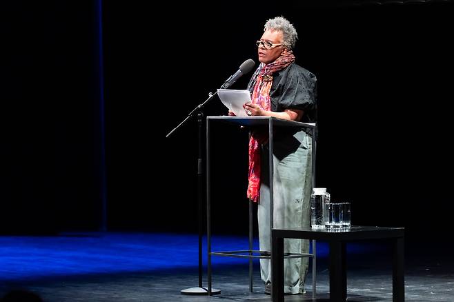 | ▲ 연설중인 미국 시인 클로디아 랭킨 뉴욕에 기반해 활동하는 시인이자 극작가, 클로디아 랭킨 (Claudia Rankine)이 베를린시축제의 하이라이트인 베를린-시강연 (Berliner Rede zur Poesie)의 개회사를 맡아 열정적인 연설을 했다. |
