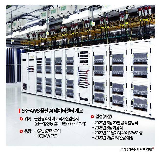 울산 미포 국가산업단지에 조성 중인 AI 데이터센터는 SK가 SK텔레콤을 중심으로 세계 1위 클라우드 기업 아마존웹서비스(AWS)와 손잡고 구축하는 국내 최대급 민간 AI 전용 센터다. 약 6만장의 그래픽처리장치(GPU)를 수용할 수 있도록 만들 예정이다. 2029년까지 103㎿, 이후 1GW급 확장까지 고려된 구조로 설계됐다.