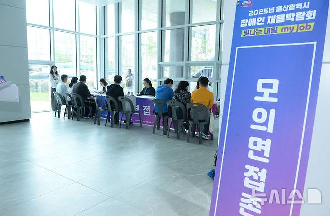 [울산=뉴시스] 배병수 기자 = 20일 울산 남구 종하이노베이션센터에서 열린 '2025 울산 장애인채용박람회'에서 구직자들이 모의면접을 보고 있다. 2025.06.20.bbs@newsis.com.
