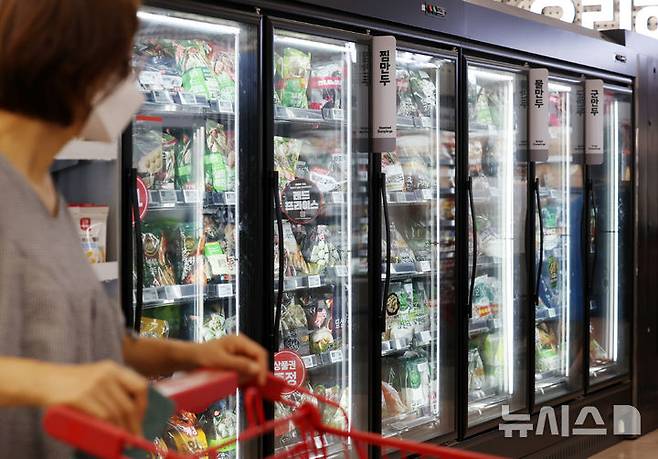 [서울=뉴시스] 조성우 기자 = 20일 서울 한 대형마트에서 시민이 냉동만두를 살펴보고 있다.