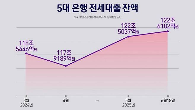 오늘(20일) 금융권에 따르면 5대 시중은행(KB국민·신한·하나·우리·NH농협은행)의 6월18일 기준 전세대출 잔액은 122조6182억원을 기록했습니다.