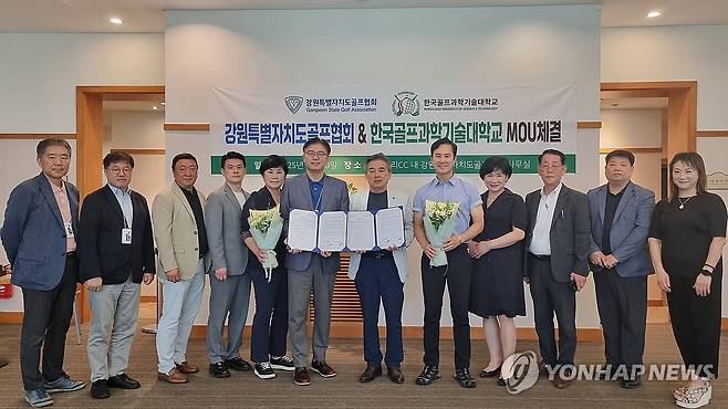 (원주=연합뉴스) 20일 강원 원주시 오크밸리 리조트에서 열린 골프 전문 인재 양성을 위한 산학협력 협약식에서 이현수 한국골프과학기술대학교 총장과 김창호 강원특별자치도골프협회장이 협약서에 서명한 뒤 양 기관 참석자들과 기념 촬영하고 있다.