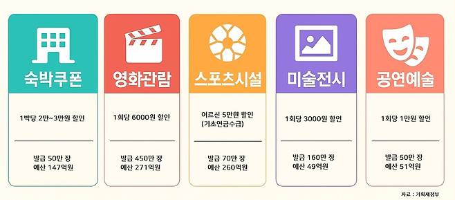 숙박 쿠폰의 경우 1박당 2만~3만원이 할인되는 쿠폰으로 총 50만 장이 발급된다. 영화 관람은 1회당 6000원이 할인되며, 450만 장이 발급된다. 미술 전시는 1회당 3000원 할인되는 쿠폰이 160만 장, 공연예술의 경우 1회당 1만원 할인되는 쿠폰이 50만 장 발급된다.