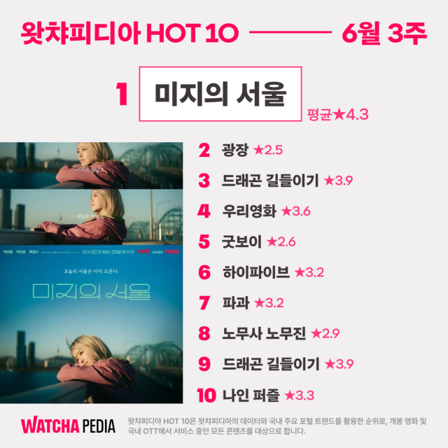 왓챠는 20일 6월 3주차(6월 12일~6월 18일) ‘왓챠피디아 HOT 10’을 공개했다. 왓챠피디아 HOT 10은 국내 최대의 평가 데이터를 보유한 왓챠피디아의 별점, 검색량, 보고싶어요, 코멘트 수 등의 지표와 국내 주요 포털 트렌드 지표를 활용해 지난 한 주간 대중들의 기대감과 만족감을 반영한 종합 순위이다. 극장에서 상영 중인 개봉 영화를 비롯해 TV 방영 프로그램, 국내 OTT에서 서비스 중인 모든 콘텐츠가 대상이며, 순위는 매주 업데이트된다.