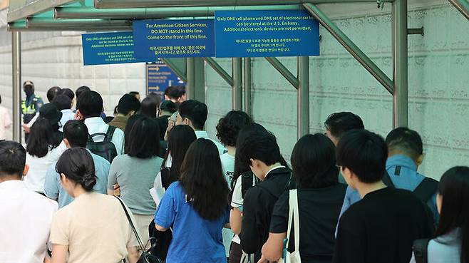 ▲ 지난달 28일 서울 종로구 주한 미국대사관 앞에서 미국 비자를 발급받으려는 사람들이 줄을 서 있는 모습
