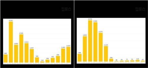 [강남3구(왼쪽)과 노도강의 신고가 거래 추이 (집토스 제공=연합뉴스)]