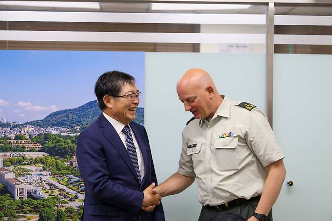 [서울=뉴시스] 백승주 전쟁기념사업회장(왼쪽)과 로이 실렌 네덜란드 국방대학교 사령관(오른쪽)이 20일 서울 용산구 전쟁기념사업회 홍보존에서 악수를 하고 있다. (사진=전쟁기념사업회 제공) 2025.06.20. photo@newsis.com *재판매 및 DB 금지