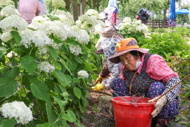 19일 충남 공주시 유구읍 유구천변 유구색동수국정원에서 공무원과 공공근로 인력들이 개막을 일주일가량 앞둔 제4회 유구색동수국정원 꽃 축제 준비로 분주하다. 축제에선 27~29일 앤드리스썸머·핑크아나벨 등 22종 2만000주의 수국을 선보일 예정이다.