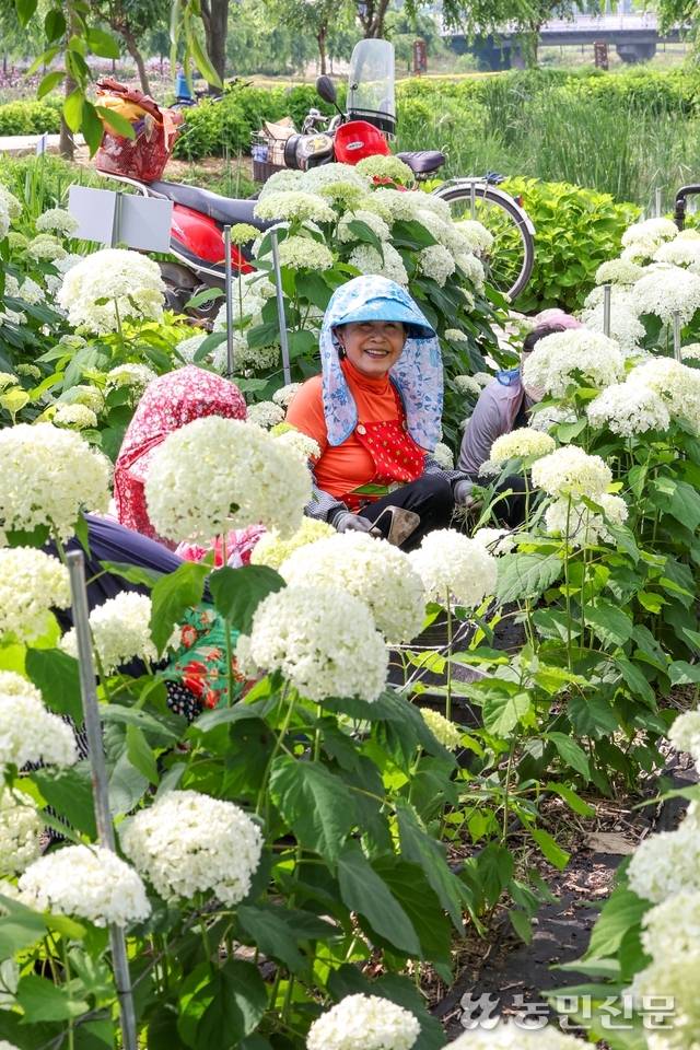 19일 충남 공주시 유구읍 유구천변 유구색동수국정원에서 공무원과 공공근로 인력들이 개막을 일주일가량 앞둔 제4회 유구색동수국정원 꽃 축제 준비로 분주하다. 축제에선 27~29일 앤드리스썸머·핑크아나벨 등 22종 2만000주의 수국을 선보일 예정이다.