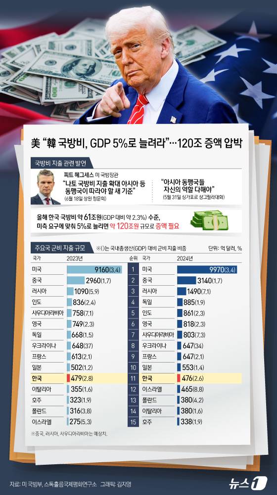[오늘의 그래픽] 美 "韓 국방비, GDP 5%로 늘려라"…120조 증액 압박