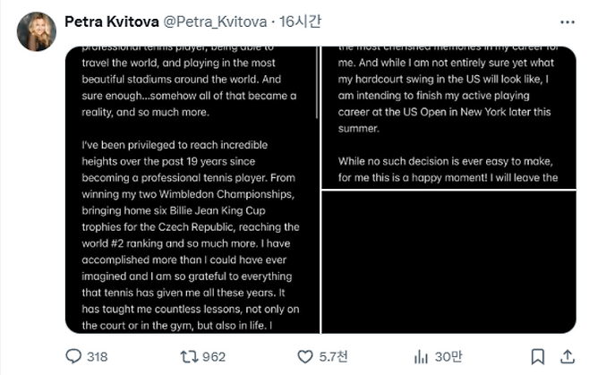 소셜 미디어 'X'에 은퇴 성명문을 발표한 크비토바