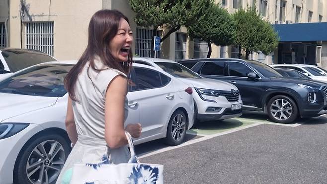 공개된 사진 속 안선영은 서울 용산경찰서 앞에서 환하게 웃으며 포즈를 취하고 있다.