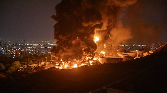 ▲ 이란 테헤란의 샤란 석유 창고에 이스라엘의 공격 이후 불길과 연기가 하늘로 치솟고 있다.