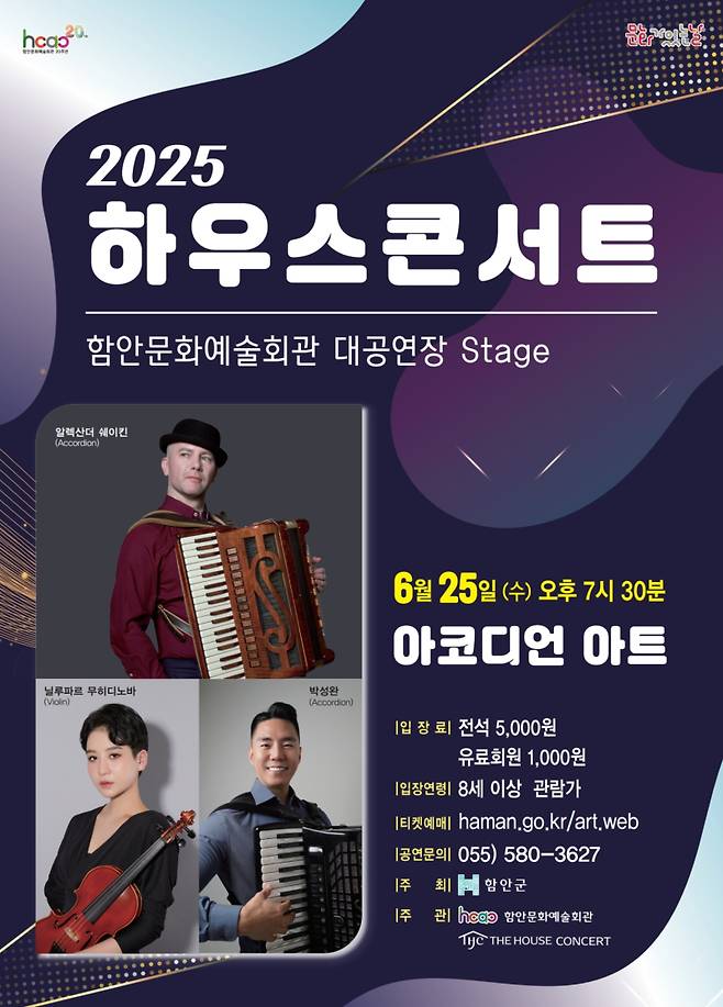 함안문화예술회관의 6월 문화가 있는 날 하우스콘서트 공연이 6월25일 오후 7시30분 함안문화예술회관 대공연장에서 열린다. 이번 공연은 세계적인 아코디언 연주자 알렉산더 쉐이킨과 박성완, 그리고 감성적인 바이올리니스트 닐루파르 무히디노바가 결성한 크로스오버 앙상블 ‘아코디언아트’의 특별한 무대로 꾸며진다.