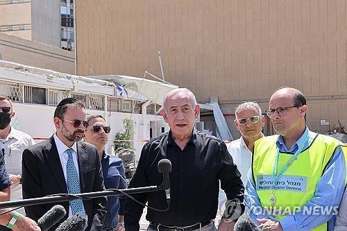 [이스라엘 병원 앞에서 발언하는 네타냐후 총리 (UPI=연합뉴스)]