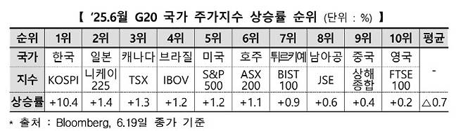 6월 한 달간 코스피 상승률은 10.2%로, G20 국가 중 1위를 기록했다(2위 일본 1.4%, 3위 캐나다 1.3%). 2025년 초부터의 누적 상승률로도 G20 내 1위(24.1%)다.