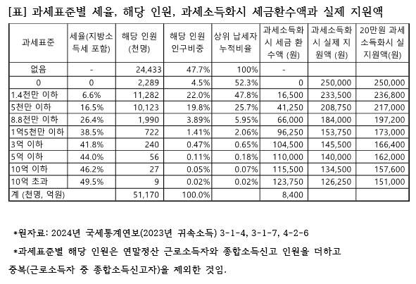 아래 표와 같이 25만 원을 과세소득에 포함시키면 연말정산 또는 종합소득세 신고 대상이 아닌 비경제활동인구나 일용근로소득자 등 저소득자(종합소득 과세표준 없음)와 면세점 이하(과세표준=0)의 국민(인구의 52.3%)은 25만 원 전액이 실제 지원금액이 되고, 연말정산 또는 종합소득세 신고자는 과세표준(소득금액에서 각종 소득공제를 뺀 금액)에 따라 6.6% 내지 49.5%의 세금(지방소득세 포함)을 내게 된다.