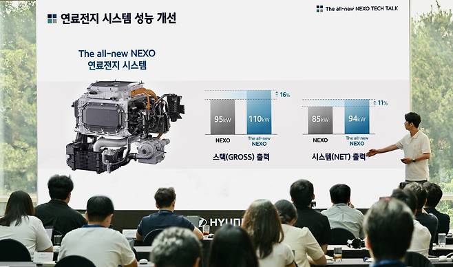 현대차 연구원들은 "소비자들의 요구를 적극적으로 반영하기 위해 디자인부터 연료시스템 전반에 걸친 개선을 이뤄냈다"고 설명했다. 수소전기차는 일반 전기차와 달리 별도의 수소저장시스템을 갖고 있다. 수소가스 충전소에서 차량에 수소를 충전해 쓴다. 수소를 넣은 차량에는 연료전지 시스템을 통해 고전압 배터리와 구동 모터 등을 통해 운행되는 구조다.
