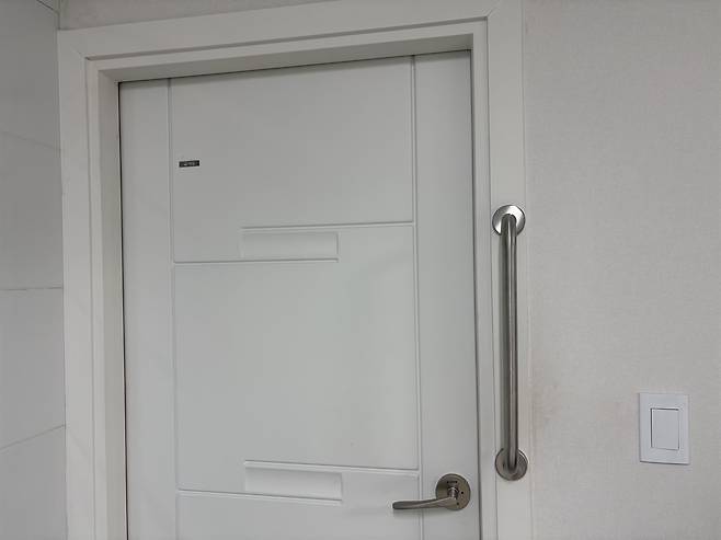 | ▲ 화장실 입구에 단 안전손잡이(핸드레일), 이것을 이용하면 화장실 출입이 한결 안전하고 용이하다. |