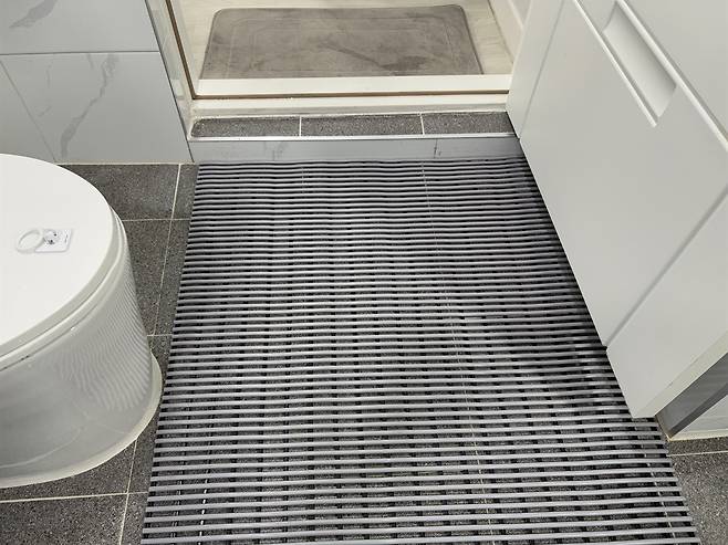 | ▲ 화장실 입구 바닥에 미끄럼 방지를 위한 매트를 구입해 깔았다. 이제는 신발을 신지 않고 바로 들어갈 수 있다. |