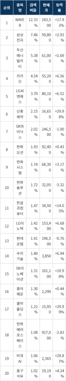 이어 검색비율 2위의 삼성전자(005930)는 상승률 2.93%로 상승 마감했다. 검색비율 3위의 두산에너빌리티(034020)는 2.69% 상승 마감했다. 검색비율 4위 카카오(035720)는 상승률 6.56%로 상승 마감했다. 검색비율 5위 LG씨엔에스(064400)는 6.52% 상승하며 마감했다.