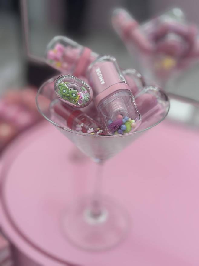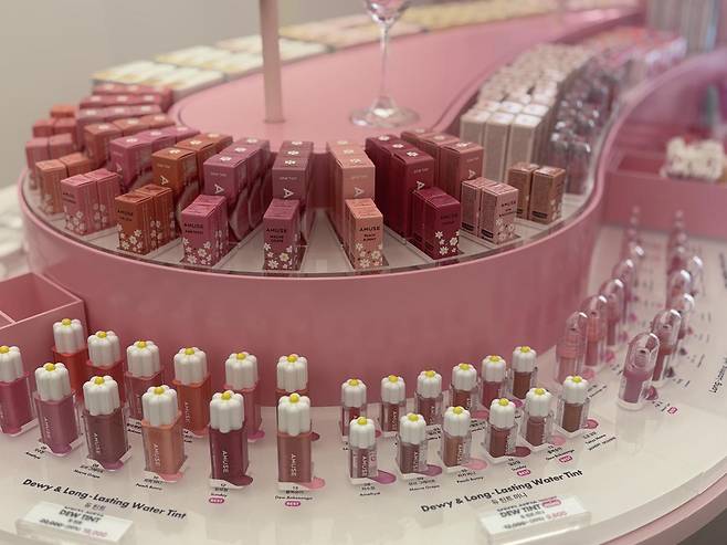 특히 립 틴트 제품은 제형에 따라 젤리 텍스처, 글로우 타입 등으로 구분돼 ‘파우더 벨벳 틴트’, ‘듀 틴트’, ‘젤핏 틴트’, ‘베베 틴트’ 등 네 가지 종류로 전시돼 있었다. 각 제품군마다 10개 이상의 색상이 진열돼 있어 매장 내에 전시된 립 틴트만 약 50종에 달했다. 일부는 핑크 하우스 매장에서만 판매되는 한정 제품으로 구성돼 있었고 테스트 후 바로 구매가 가능한 구조였다.