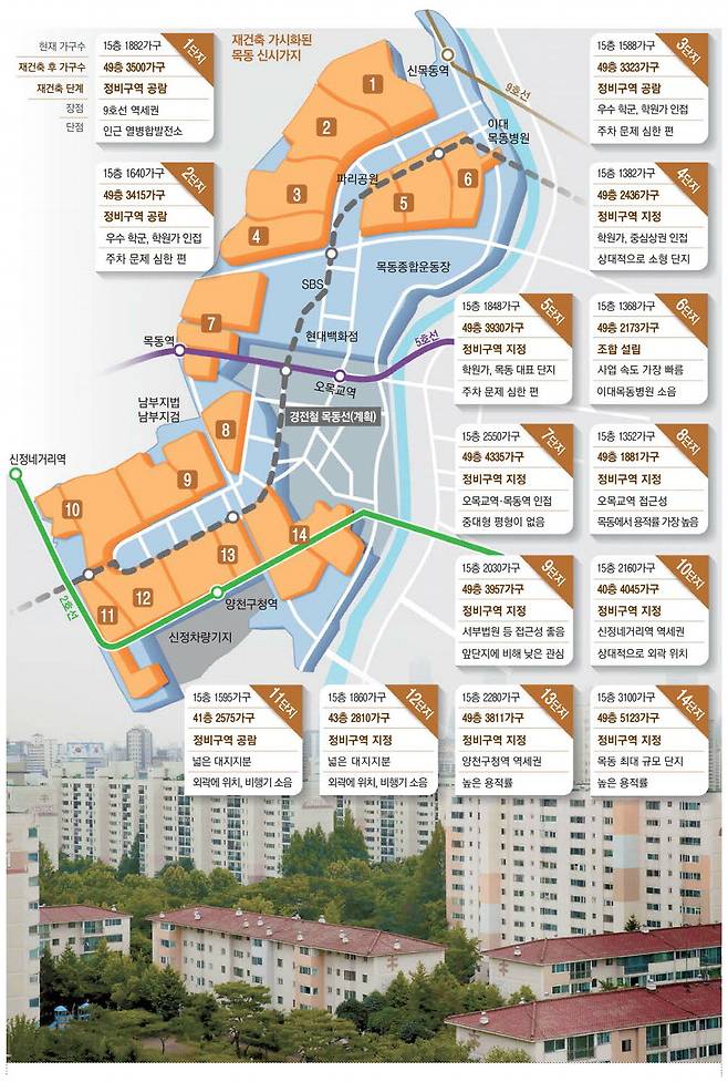 13·14단지는 2호선 지선 양천구청역이 가깝다. 14단지는 목동 아파트 중에선 유일하게 3000가구가 넘는 초대형 단지다. 재건축 이후에는 5000가구가 넘는 '매머드급' 단지로 탈바꿈한다.